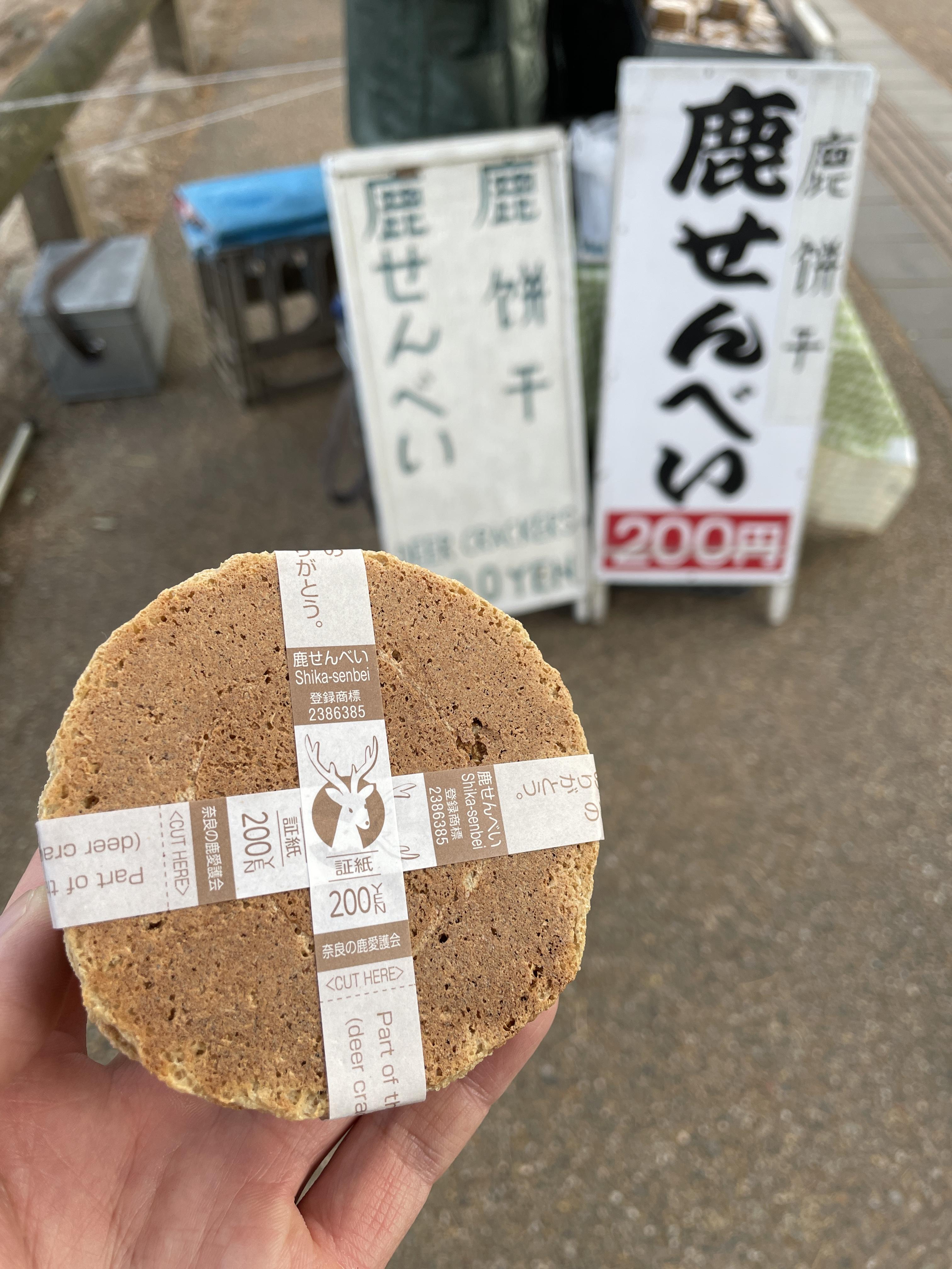 공원 곳곳에서 판매하는 200엔 짜리 사슴용 전병을 구입하면 이걸로 사슴들에게 먹이를 줄 수 있다.