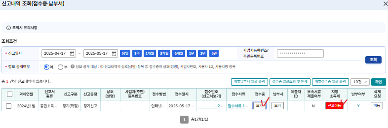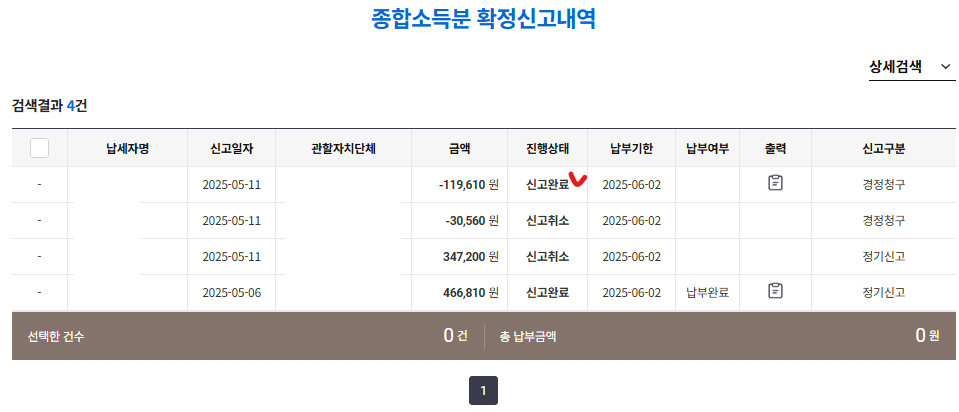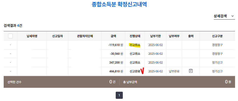 신고내역을 조회해 보면 여러가지 내역이 나온다.