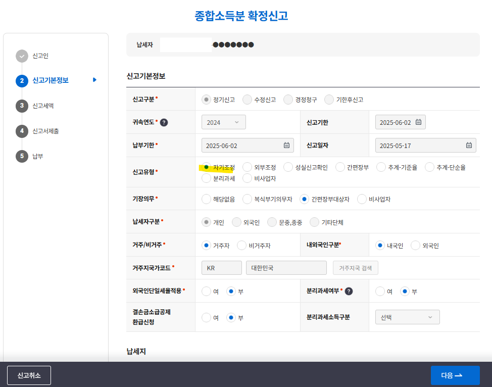 일단 자기조정으로 신고 유형을 택하면 이런 메뉴가 나타난다.