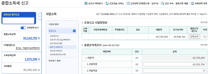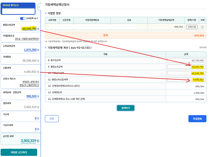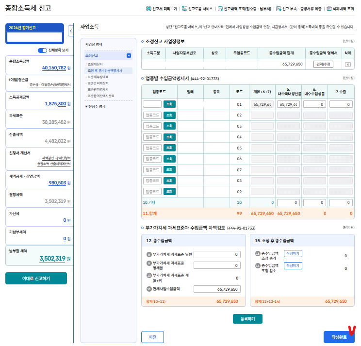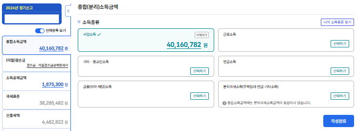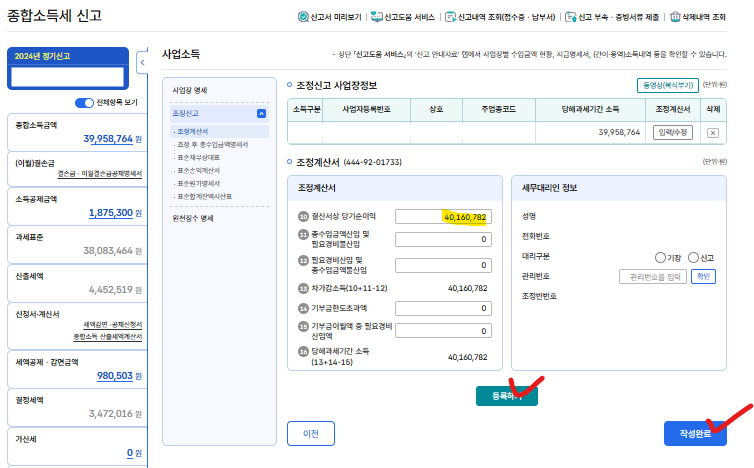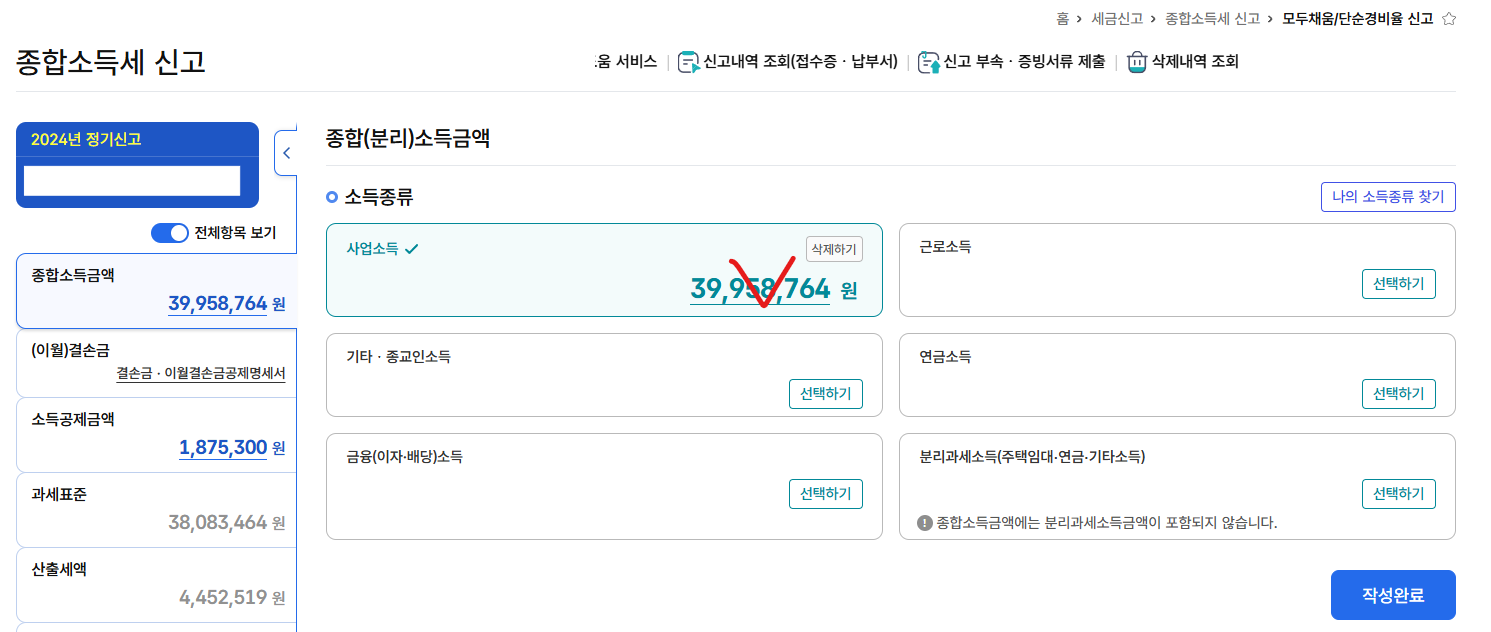 다 입력하면 이런 저런 비용들을 제하고 난 실제 사업소득액이 입력된다.