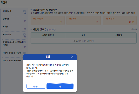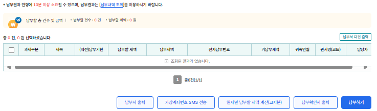 필자의 경우 납부하기를 눌러도 아무것도 뜨지 않는데, 이미 초기 신고에서 과신고되어 세금을 납부했기 때문이다.