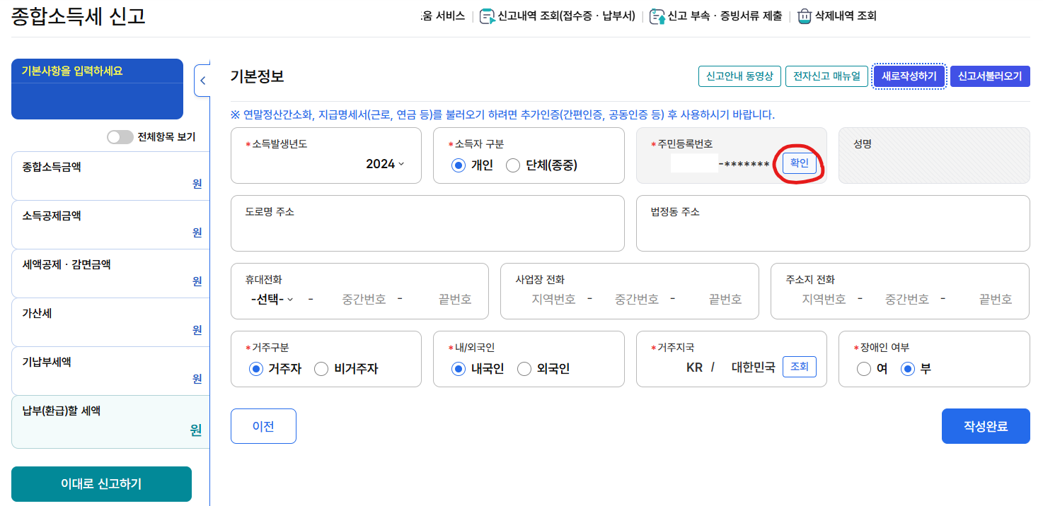 기본 정보는 주민등록번호 확인으로 어느정도 자동입력이 된다.