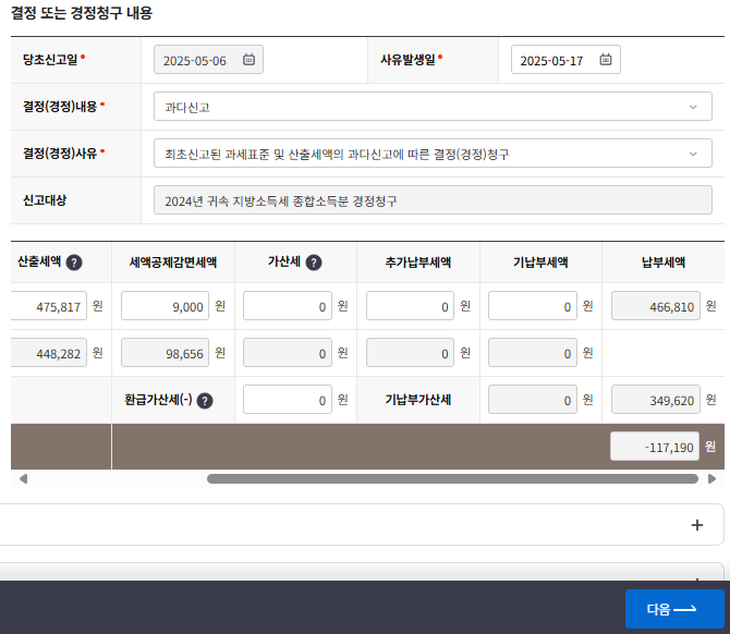 처음 신고된 세액이 커서 재신고 하는 것이므로 과다신고로 경정청구 사유를 넣어주고, 마지막에 마이너스로 환급 가산세액이 뜨는지 확인해 주자.