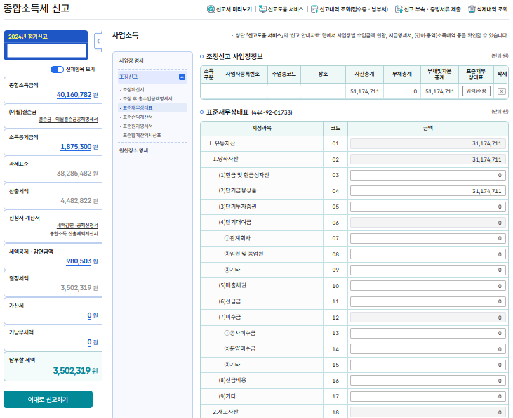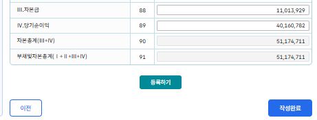 복식 장부를 잘 만들었다면 표준재무상태표가 나오는데, 이 내용을 그대로 입력해 준다.