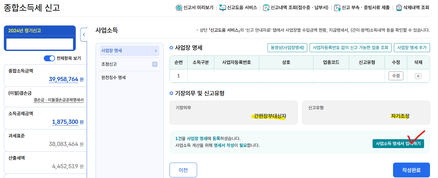 간편장부 대상자 및 자기조정 으로 잘 지정되었는지 확인 하고 사업소득 명세 입력을 시작하자.