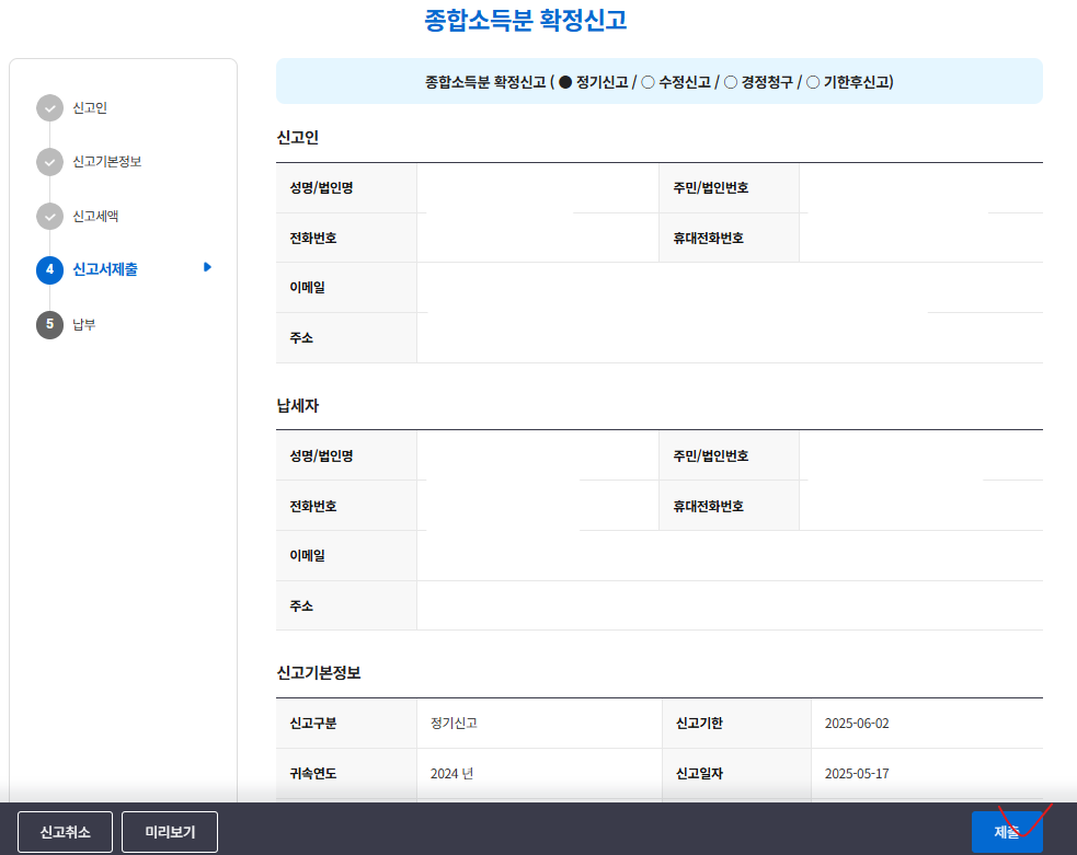 이제 진짜 끝이 보인다. 신고내용들을 마지막으로 확인하고, 환급신청계좌까지 잘 입력하고 제출을 누르면 지방세 종합소득분 경정청구까지 끝!