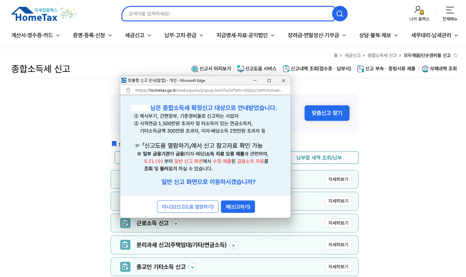 홈택스에서 종소세 신고 메뉴로 들어가면 본인의 신고 타입에 따라 어느정도 안내를 해 준다.