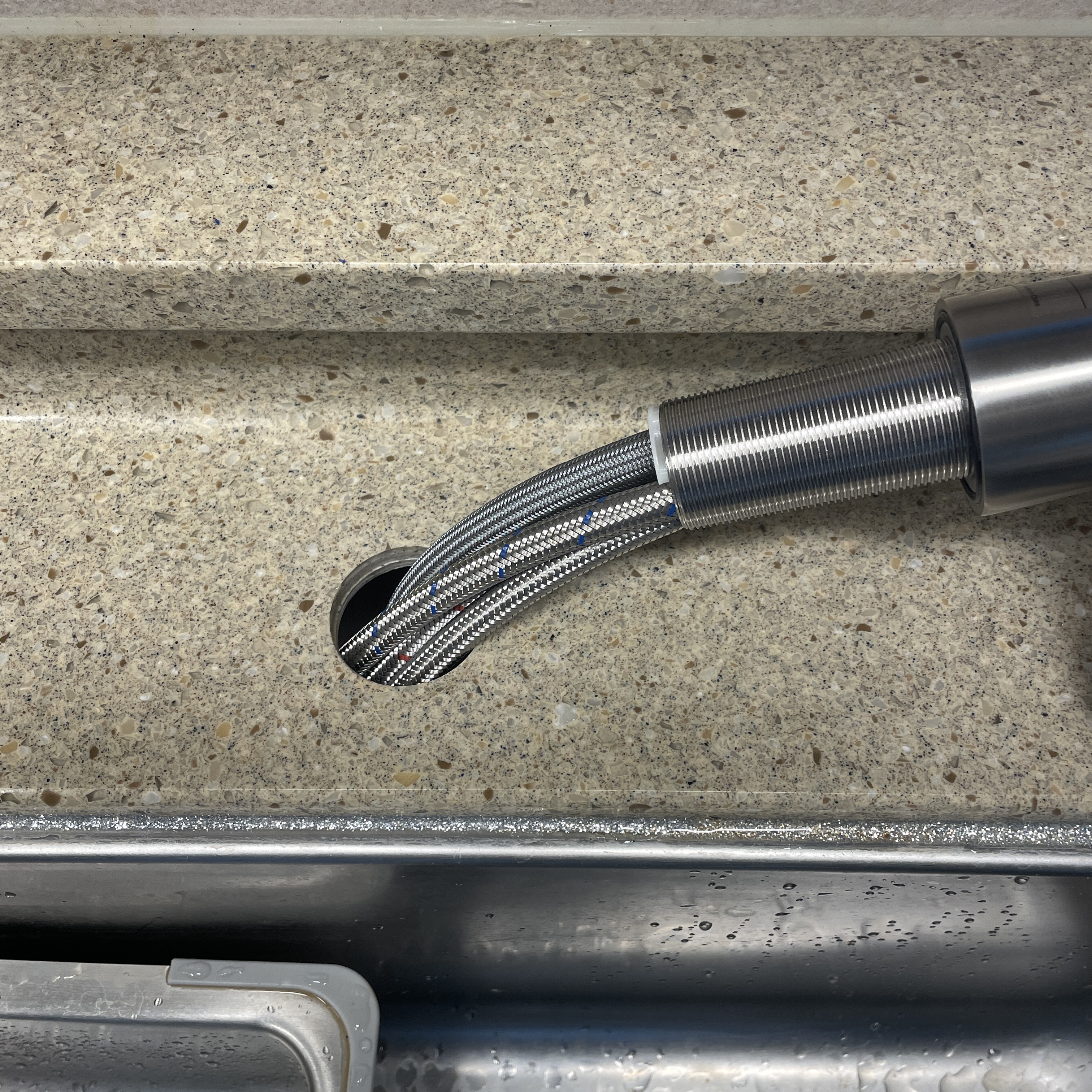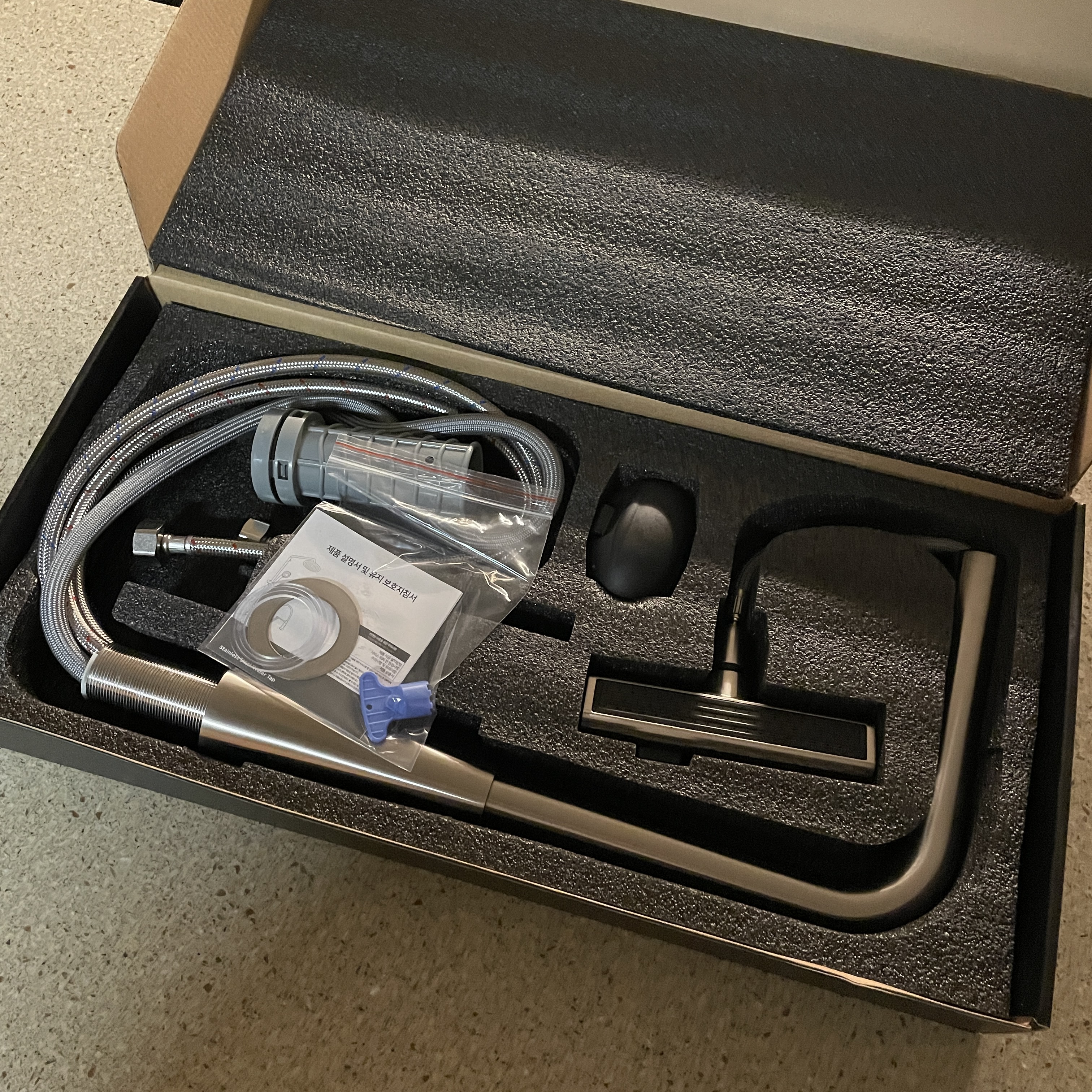 코브라형 수전들은 헤드를 원위치 시키기 위해 물호스에 무게추가 달려있다. 미리 제거해 주자.