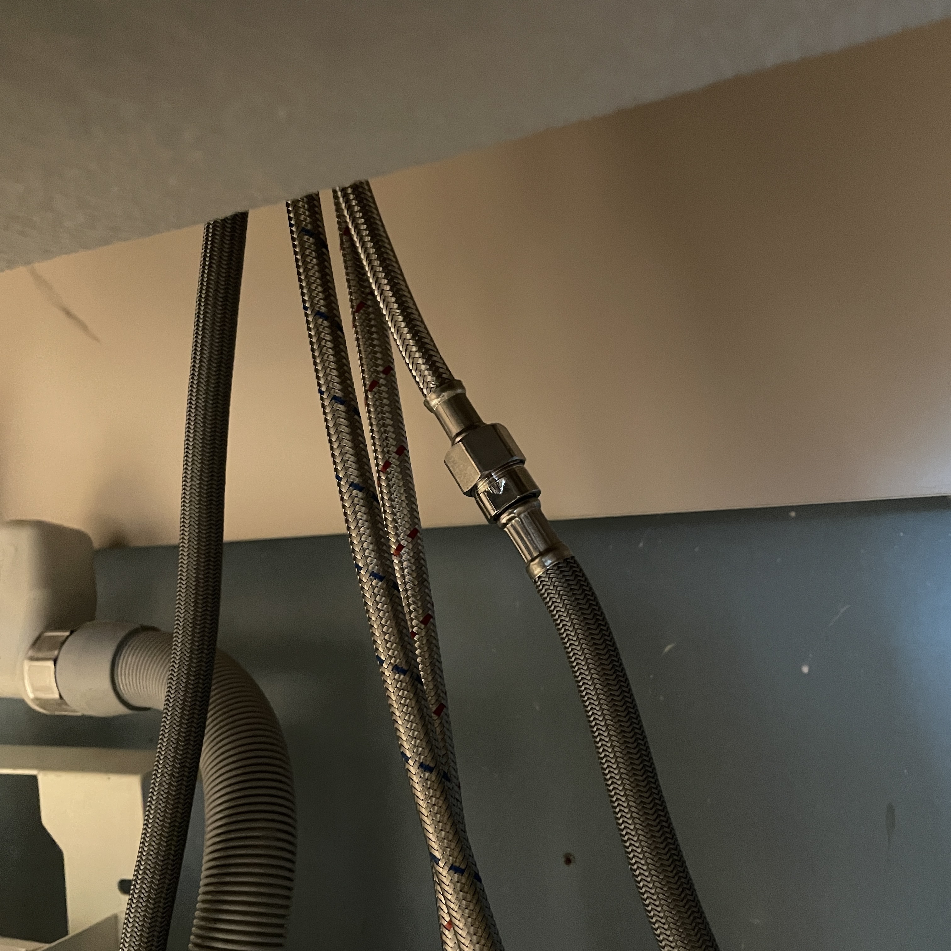 냉온수 밸브에 수전 호스까지 연결하면 대부분의 작업은 끝이다.