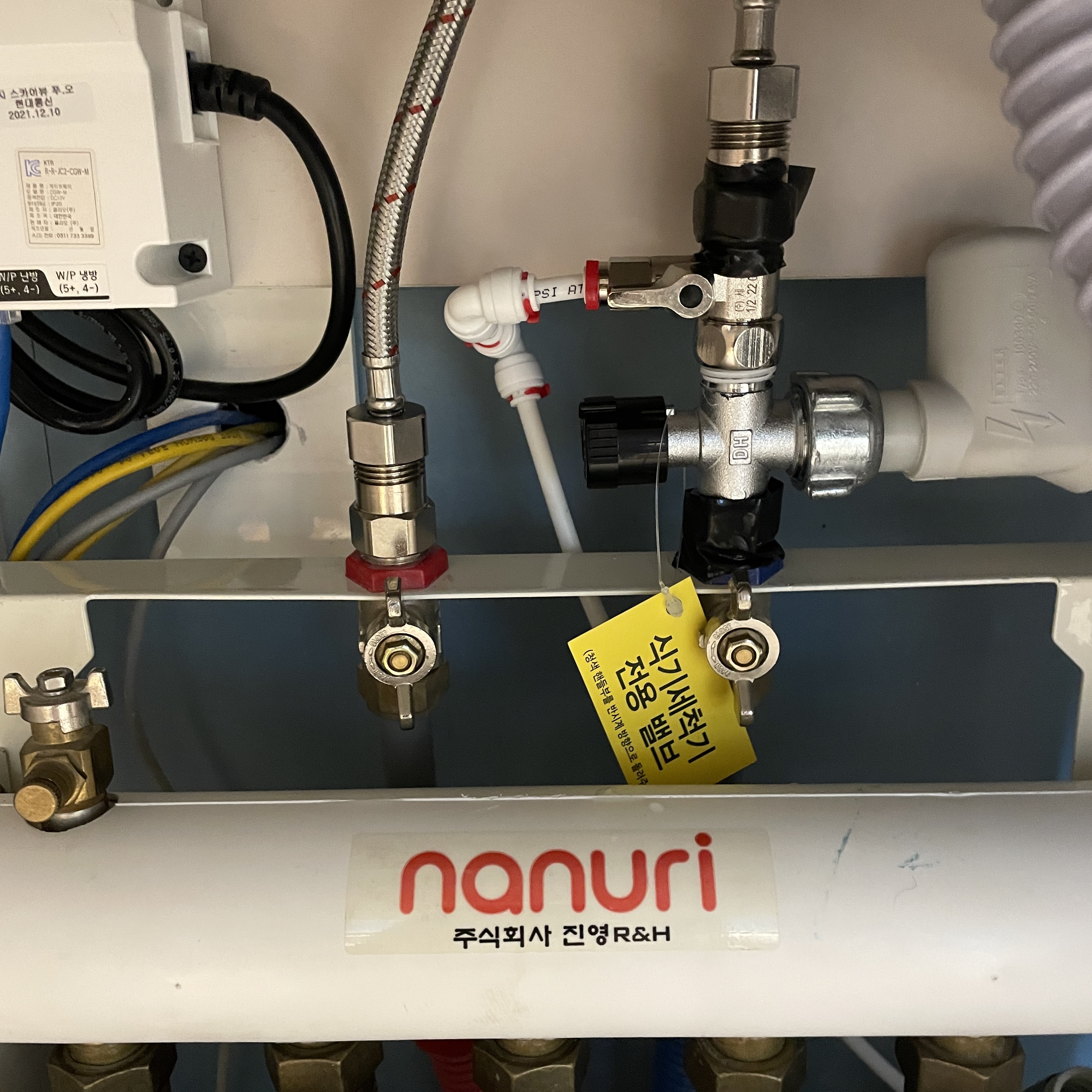 당연한 이야기지만 이걸 안 잠그고 작업하면 물바다가 된다. 수도꼭지처럼 되어있는 경우도 있고 이렇게 난방 분배기에 같이 밸브가 있는 경우도 있다.
