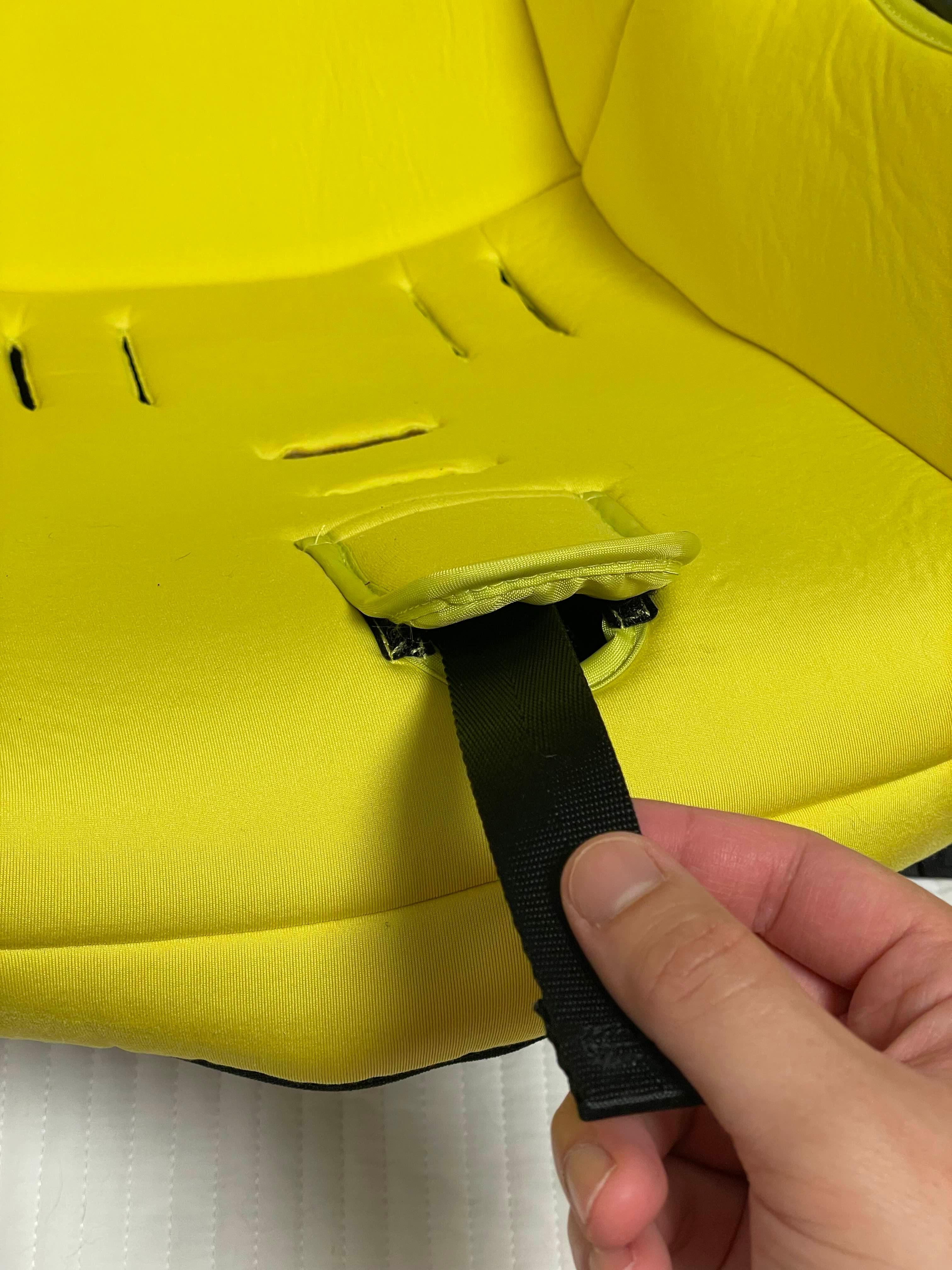 시트 뒷편에서 벨트 길이 조절끈의 T자 버클에 벨트 끈을 끼워준다.