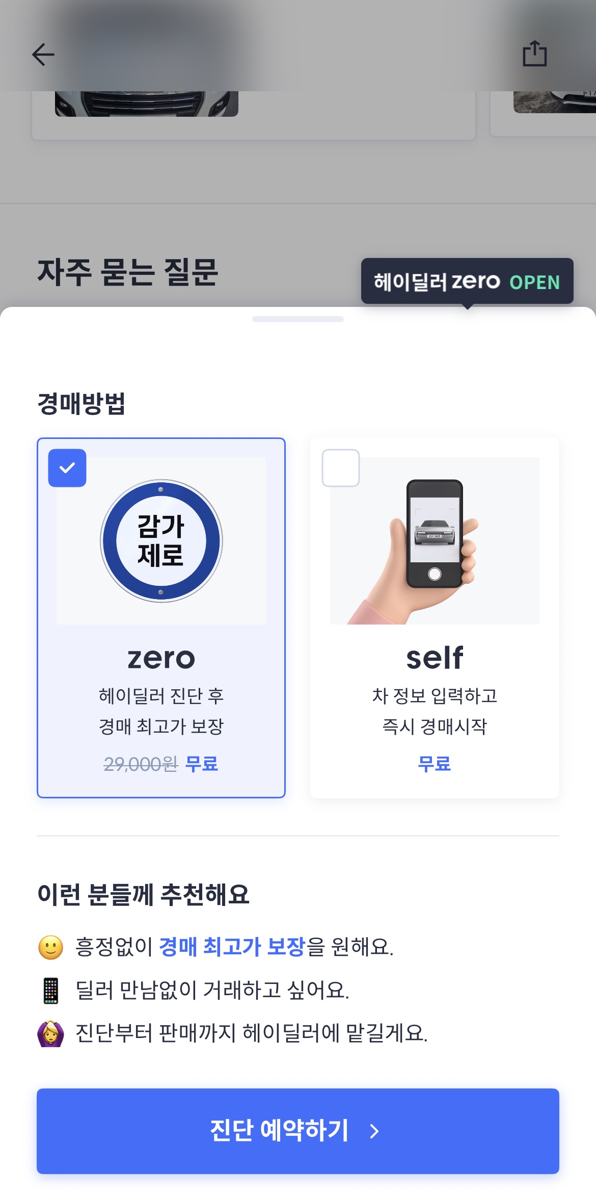 워낙 차량 정보 올리면 딜러들이 입찰하고 찾아와서 추가 확인 / 네고 후 가져가는 시스템으로 알고 있었는데 제로 경매라는 것이 생겼다.